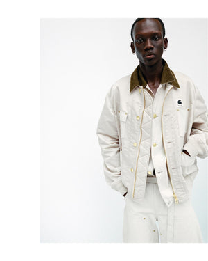 The capsule combines sacai’s signature pieces – such as its Balmacaan overcoat, tailored suiting jacket, and MA-1 blouson – with Carhartt WIP’s icons, including the Detroit Jacket, Chore Coat and Siberian Parka. Through fabrics, fits, and details, each piece unites the distinct identities of both brands: sacai’s suiting fabric and nylon twill with Carhartt WIP’s robust duck canvas; subtle contrast stitching, tool pockets, and corduroy collars reflect Carhartt WIP’s utilitarian roots, while inventive deconstruction, hybrid layering, and sculptural proportions nod to sacai’s unique design language.