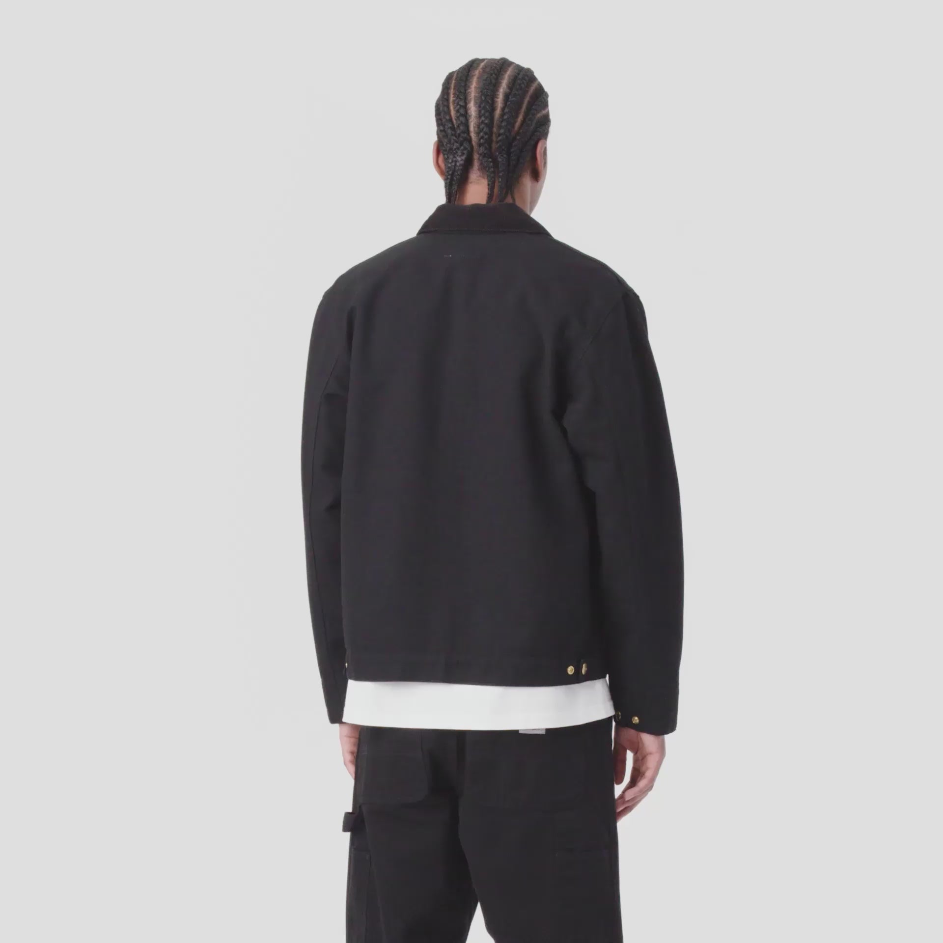 The Detroit Jacket is an unlined style made from heavyweight Dearborn Canvas, featuring a corduroy collar. The jacket fastens with a zip at the front, and can be adjusted at the cuffs and the bottom band with snap buttons. A woven Square Label appears on the chest.